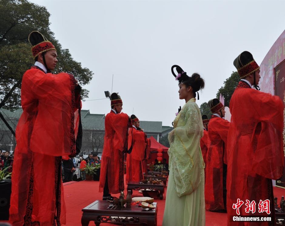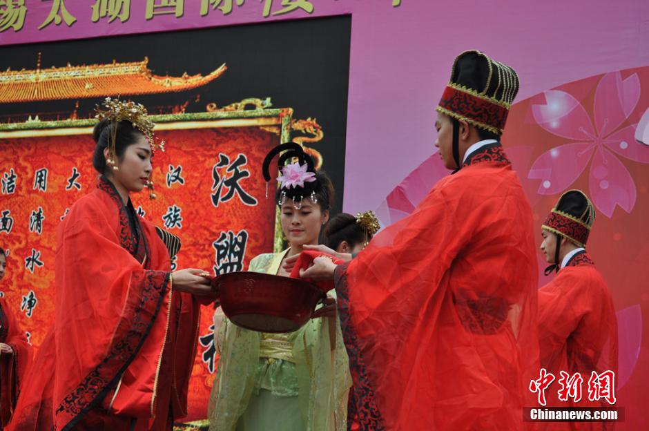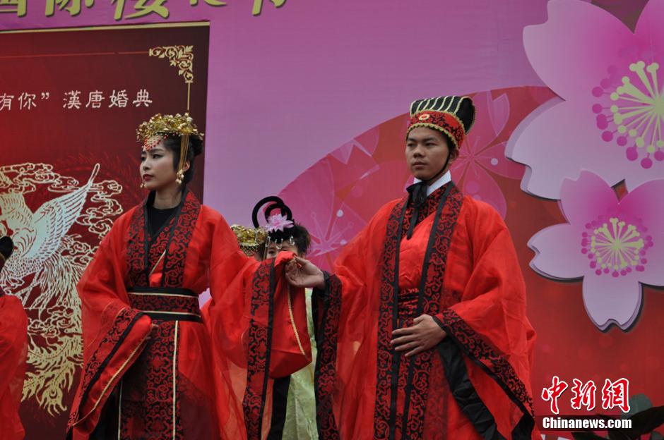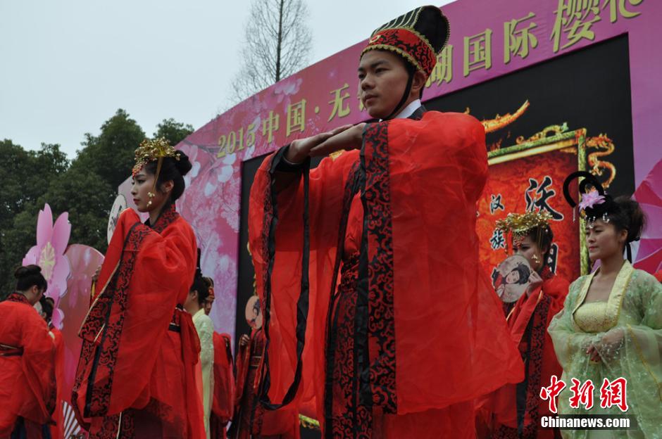 3月18日,2015中国无锡太湖国际樱花节在中华赏樱胜地太湖鼋头渚景区举行,身穿古装的模特在樱花树下“拜天地”上演婚礼秀,成为一道亮丽的风景。 孙权 摄